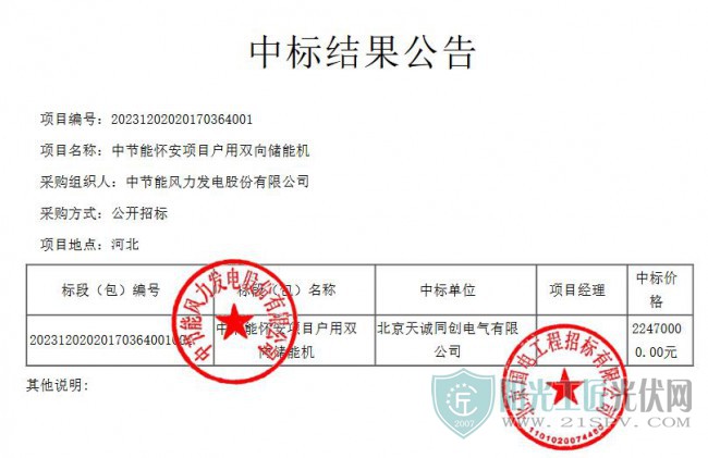 2月20日,中節能懷安項目戶用雙向儲能機中標結果公告發布,北京天誠同創電氣有限公司以2247萬元中標該項目,折合單價0.749元/Wh。